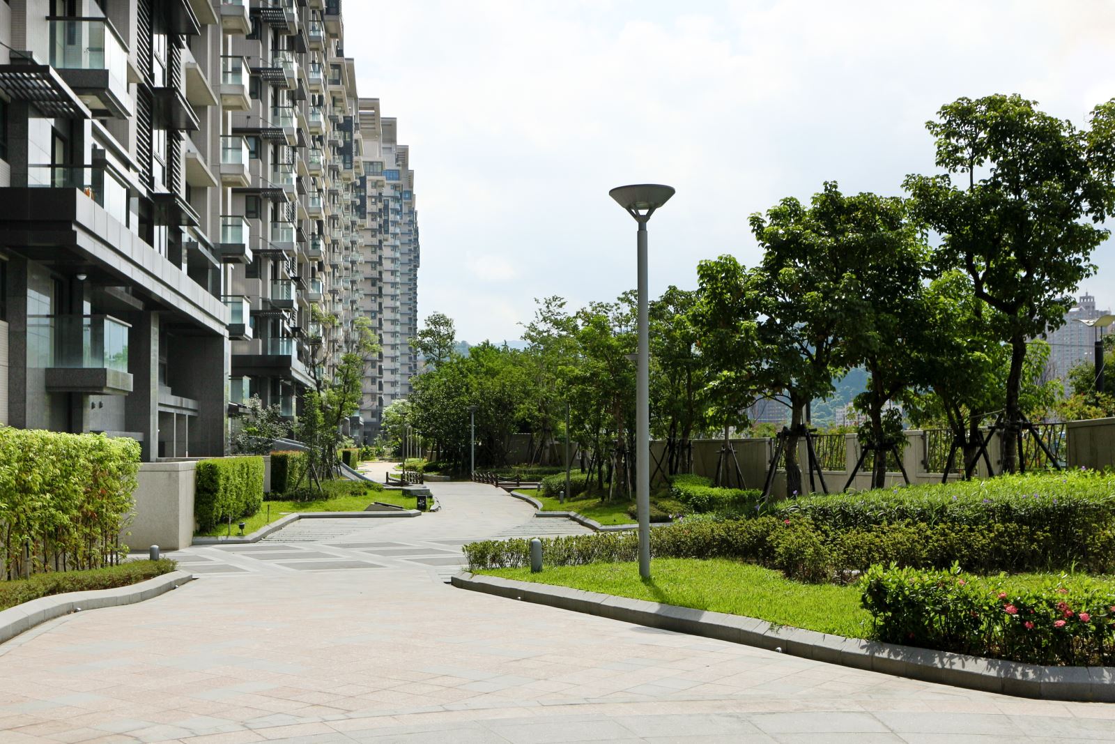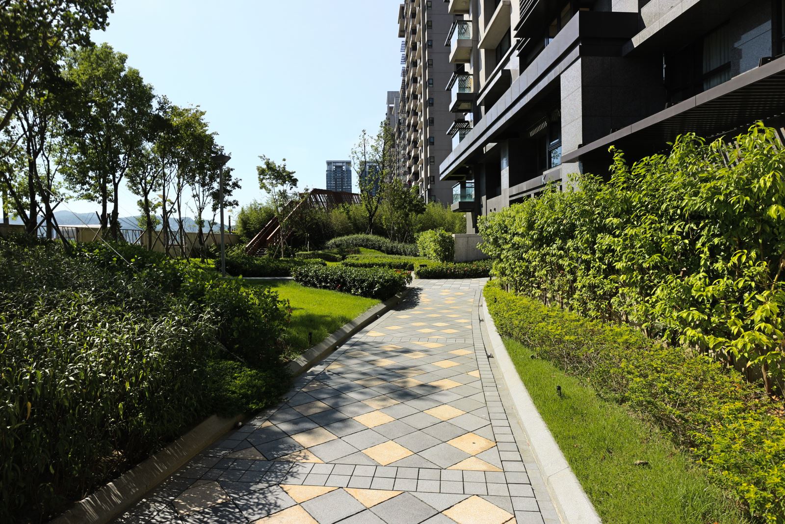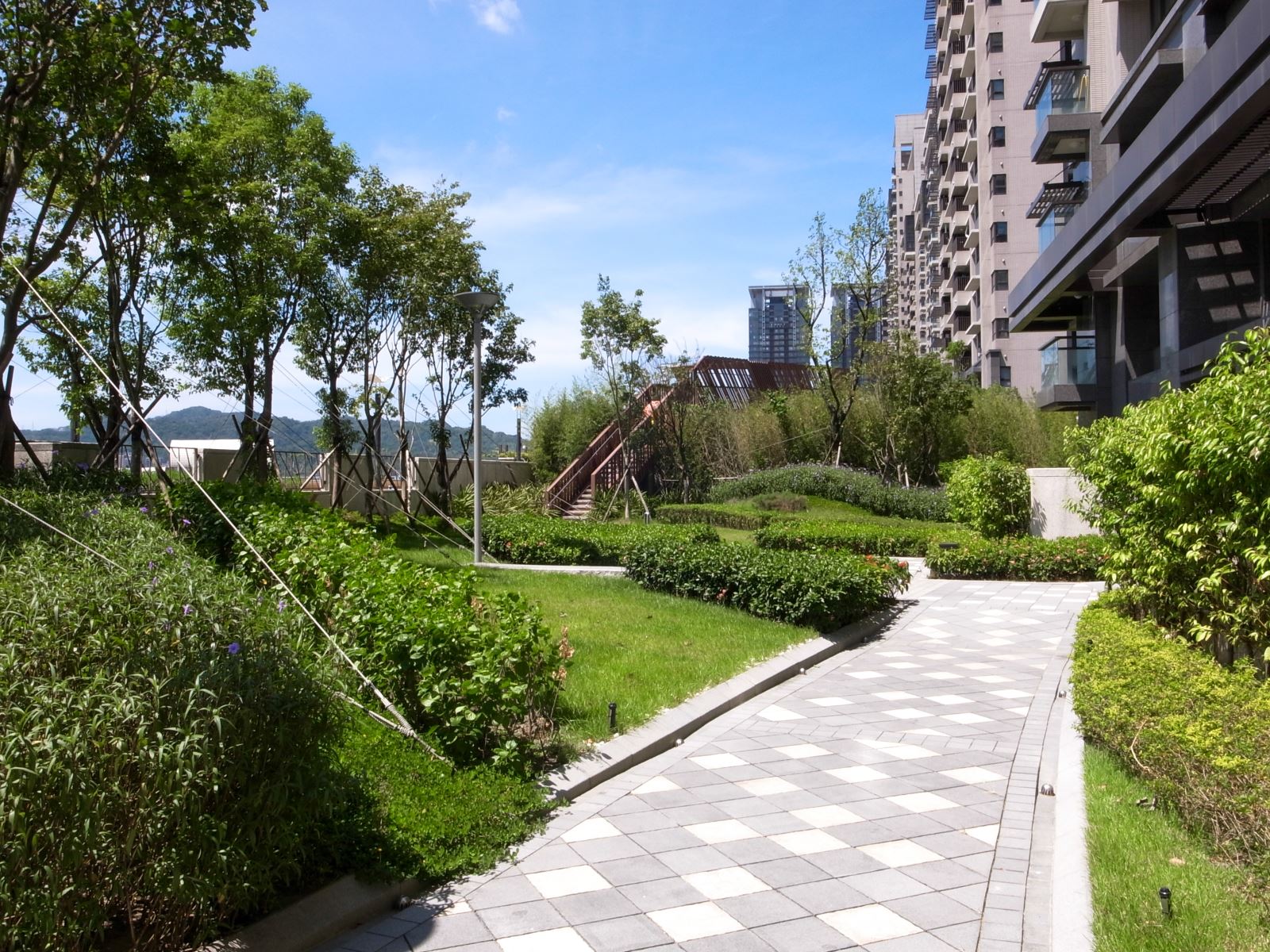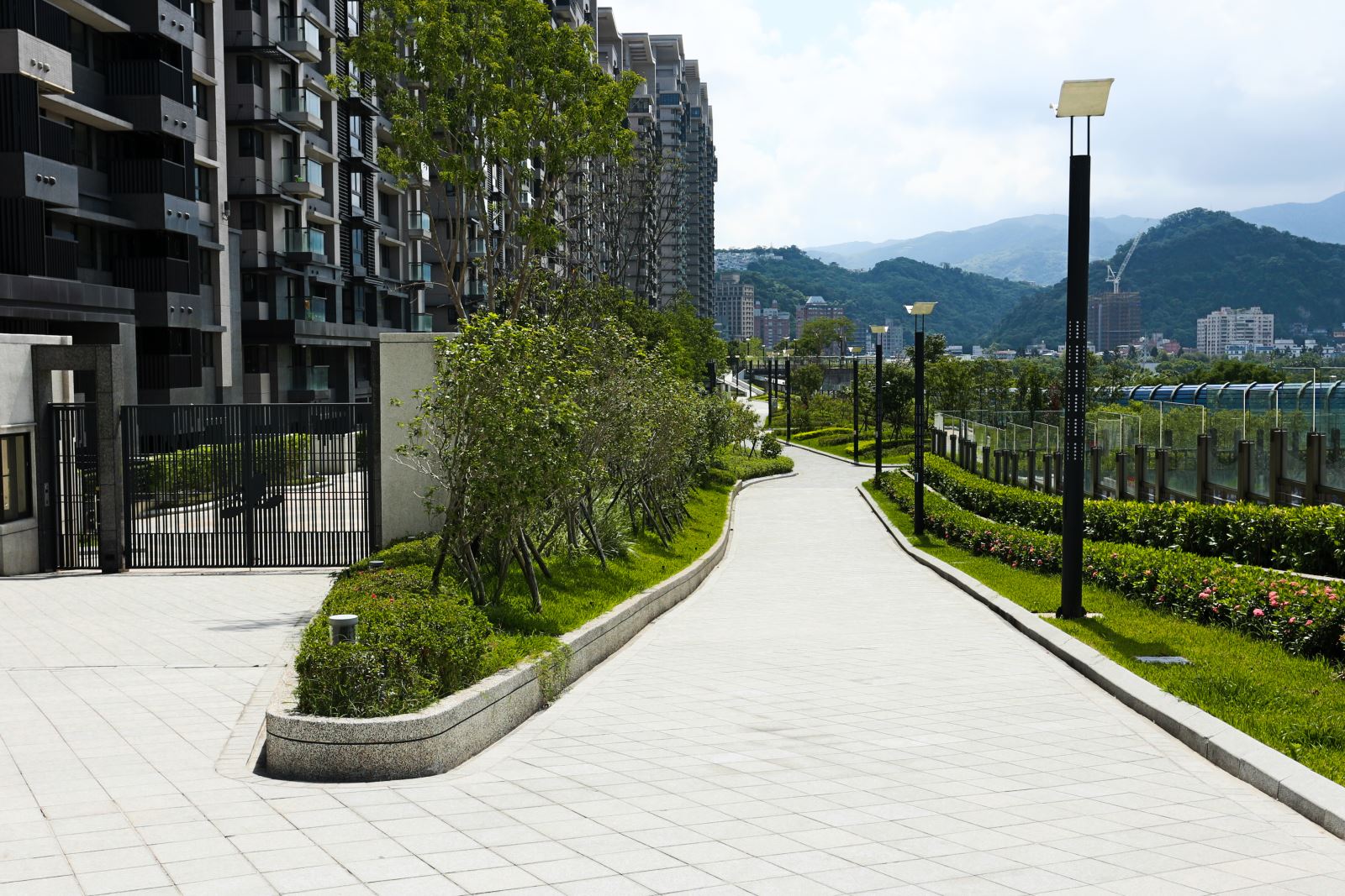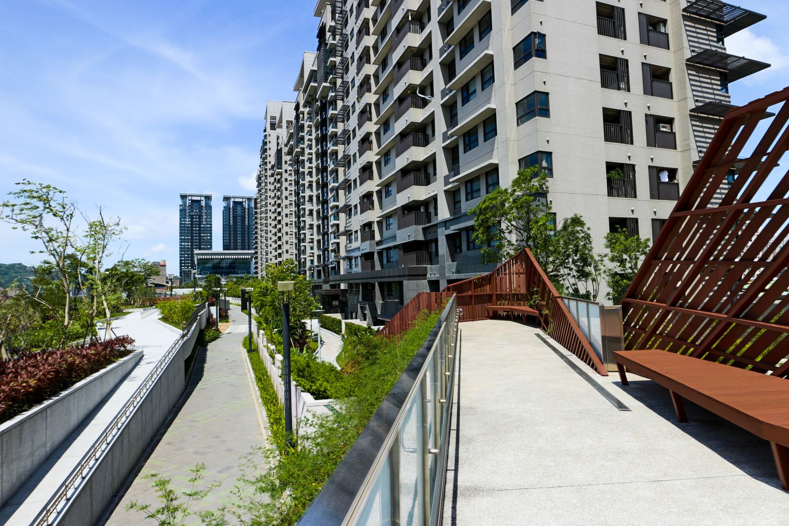整體設計著重於開放空間與植栽的層次感,營造出豐富的視覺景觀。社區內的步道與休憩區穿梭於綠意之間,讓居民能隨時親近自然。透過水景、植栽與空間規劃的結合,美河市的景觀設計不僅提升了居住品質,也為住戶提供了兼具美觀與實用性的生活環境,完美詮釋了都會中的綠洲生活。